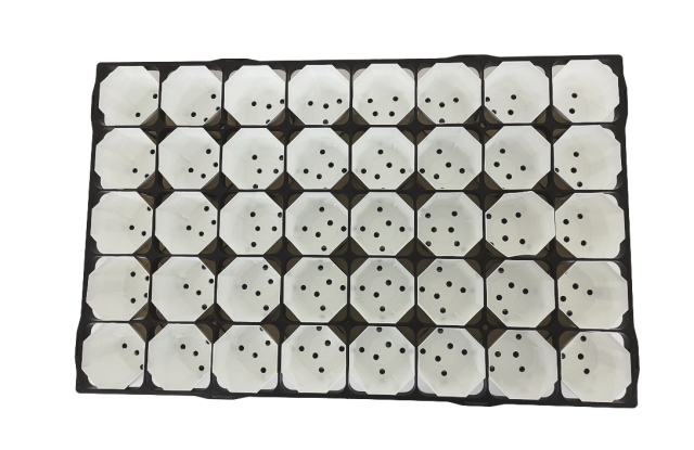 2Yポット白色、40個とTO-40のトレーセットです。それぞれ違うメーカーなのですが、ぴったりとハマってます。(シンデレラフィットです)2Yは8角形でサイズは対角線で6.4cmx高さ6.2cmです。 トレーのサイズは33cmx52.3cmx高さ6.5cm、穴のサイズは6.1x6.1cmです。