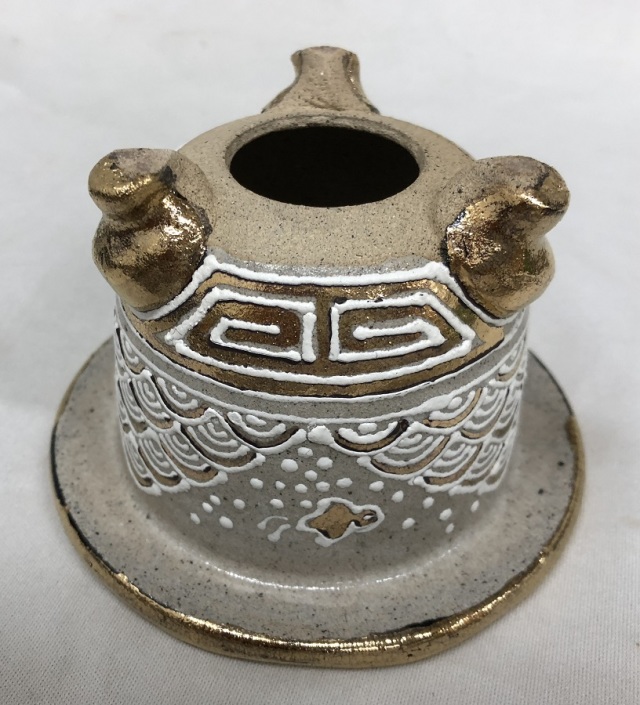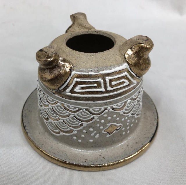 京楽焼 富貴蘭鉢 3.5号です。サイズは外寸10.8cmx高さ7.2cmです。内径は約7.5cm、底穴の大きさは2.8cmです。