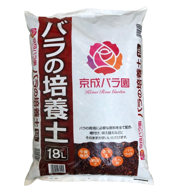 京成バラ園が長年にわたって研究した結果、バラの栽培に適するように配合したバラ専用の培養土です。赤玉土を中心に、醗酵牛糞、くん炭、パーライト、堆肥(微量要素配合)、などバラの栽培に必要な原料をすべて含んでいるため、バラの植付け、植え替えなどにそのままお使いいただけます。