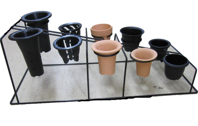 材質は鉄にビニールコーティングです。写真の中で掛かっている鉢は春蘭プラ鉢3.5号、春蘭プラ鉢3.3号、富貴蘭プラ鉢3.5号、富貴蘭プラ鉢N型3.5号、素焼き鉢3.5号、ロクロラッパ鉢3号、ロクロラッパ鉢3.5号、G-35、ウチョウラン3.5号、KU-30です。
