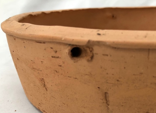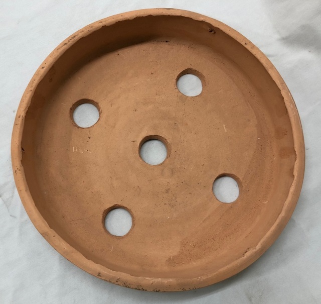 素焼きの皿鉢10号です。素人の手作り品ですので、仕上げの悪さはご了承くださいませ。 通常の浅鉢よりも深さがなく、横に成長する蘭には最適の鉢です。サイズは外寸30.3cm(内寸28cm)x高さ5.7cm、底穴の大きさは3cmが5穴です。こちらは手作り品の為、仕上げが荒い商品です。見た目を気にする方はご購入をご遠慮下さい。 吊るす為の穴が3か所空いています。数量限定で在庫あるのみです。