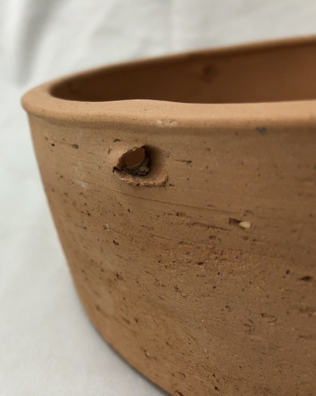 素焼きの皿鉢8号です。素人の手作り品ですので、仕上げの悪さはご了承くださいませ。 通常の浅鉢よりも深さがなく、横に成長する蘭には最適の鉢です。サイズは外寸24cm(内寸22cm)x高さ7.2cm、底穴の大きさは3cmが5穴です。こちらは手作り品の為、仕上げが荒い商品です。 横に3か所吊るせる為の穴が空いてます。 見た目を気にする方はご購入をご遠慮下さい。 数量限定で在庫あるのみです。