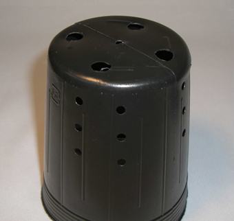 側面穴付ポリポットで深いタイプです。サイズは直径10.5cmx高さ12cm、容量は810ccです。側面の穴の数は24個、底穴は4個です。側面の多孔性の穴に加え、鉢底もすべて複数の穴を標準としているので、いっそう水はけ、通気性に優れています。画像は1個ですが、100個セットです。