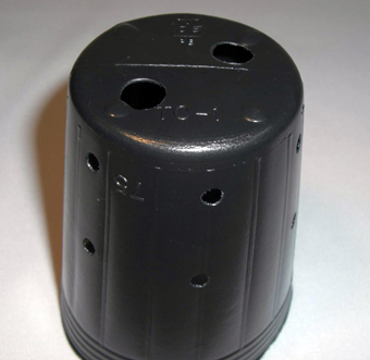 側面穴付ポリポットで深いタイプです。サイズは直径7.5cmx高さ9cm、容量は300ccです。側面の穴の数は12個、底穴は2個です。側面の多孔性の穴に加え、鉢底もすべて複数の穴を標準としているので、いっそう水はけ、通気性に優れています。画像は1個ですが、100個セットです。